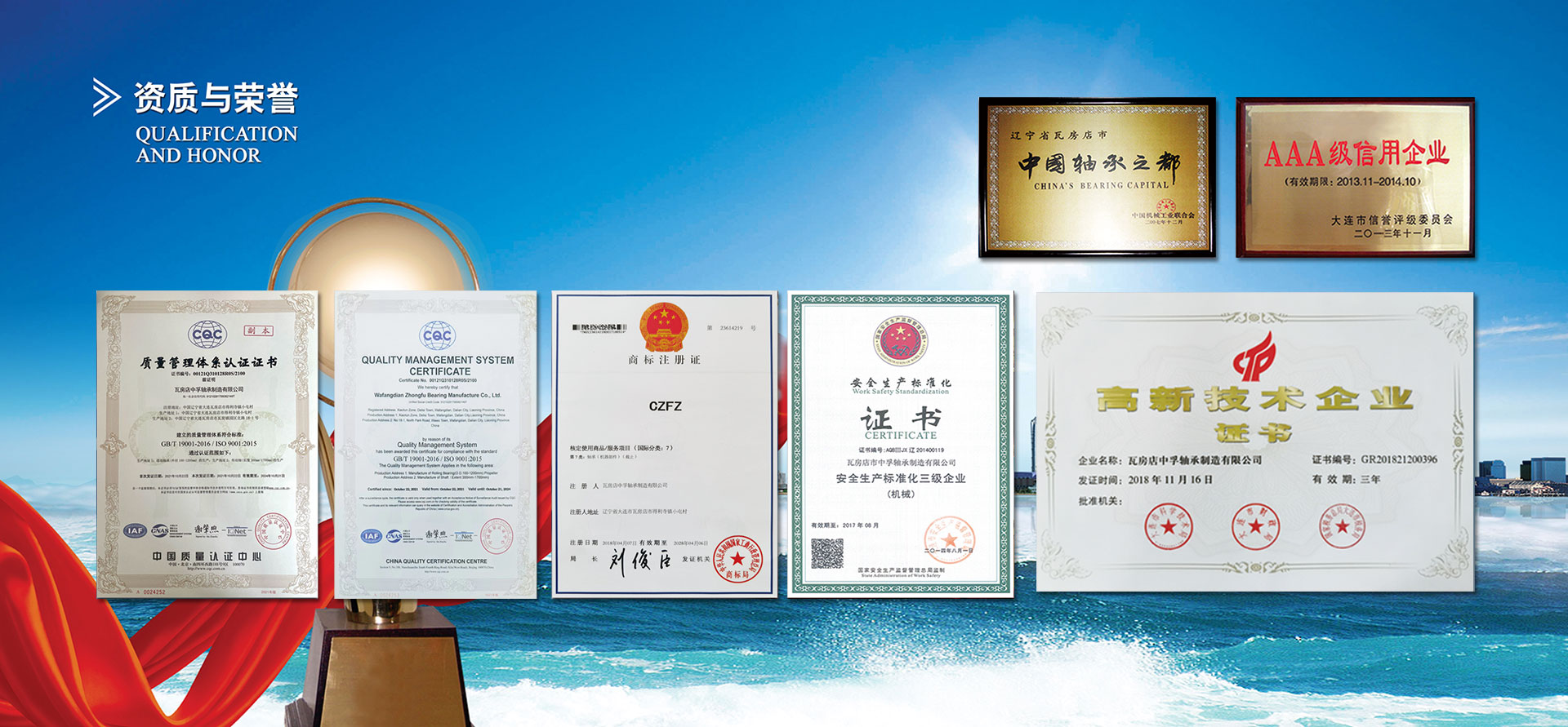 瓦房店中孚軸承制造有限公司專業(yè)生產礦用汽車軸承和配件,擁有獨立礦用汽車軸承設計和產品研制部門,具備開發(fā)礦用汽車軸承的能力,保證軸承的使用壽命和高穩(wěn)定性,并建立了完整的質量體系,已通過ISO9001:2015質量管理體系認證。